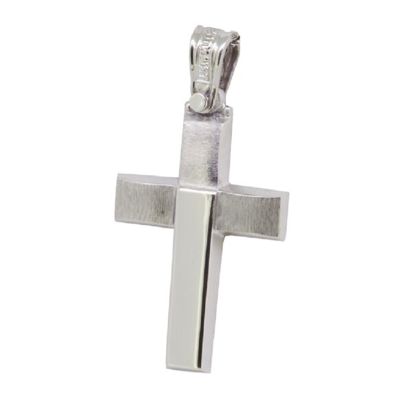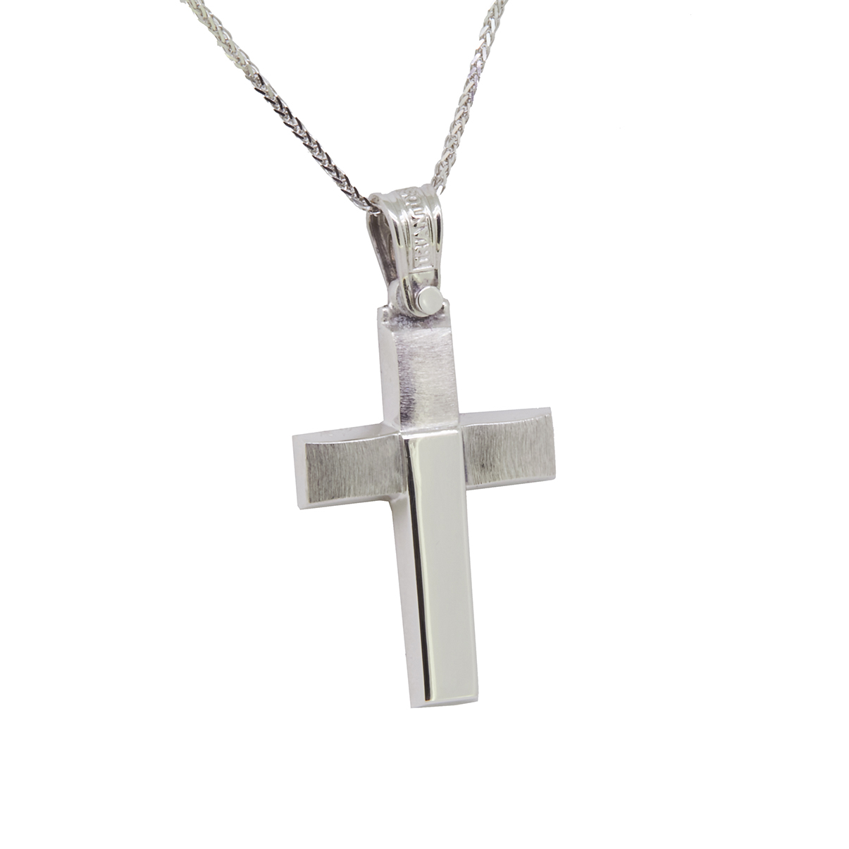 Ένας μοντέρνος ανδρικός σταυρός από την εταιρία Τριάντος με λουστρέ και ματ επιφάνεια, σε λευκό χρυσό δεκατεσσάρων καρατίων