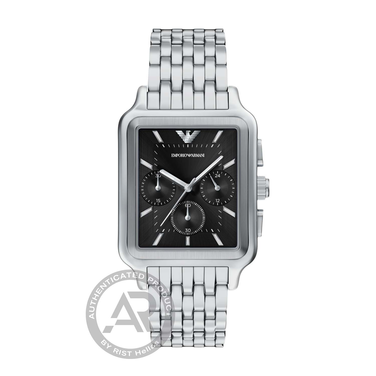 Εντυπωσιακό σπορ ανδρικό ρολόι Emporio Armani με ορθογώνια ανοξείδωτη ατσάλινη κάσα, μαύρο καντράν, μηχανισμό με χρονογράφο
