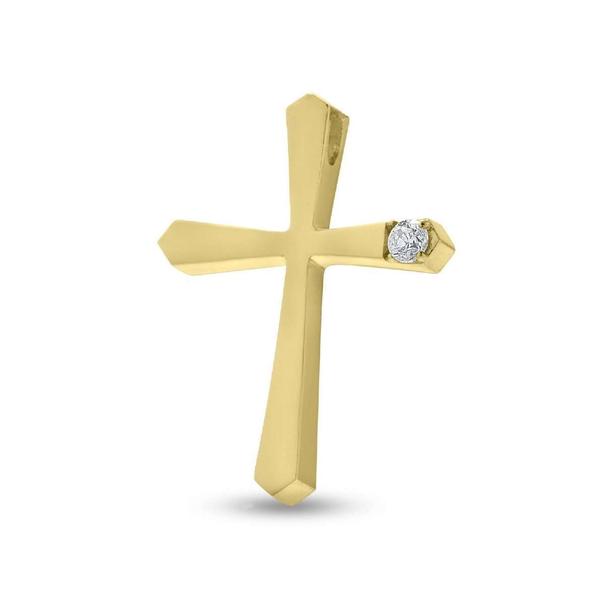 Μοντέρνος γυναικείος σταυρός με ιδιαίτερη τεχνοτροπία και σχεδιασμό, από κίτρινο χρυσό δεκατεσσάρων καρατίων και ζιρκόν