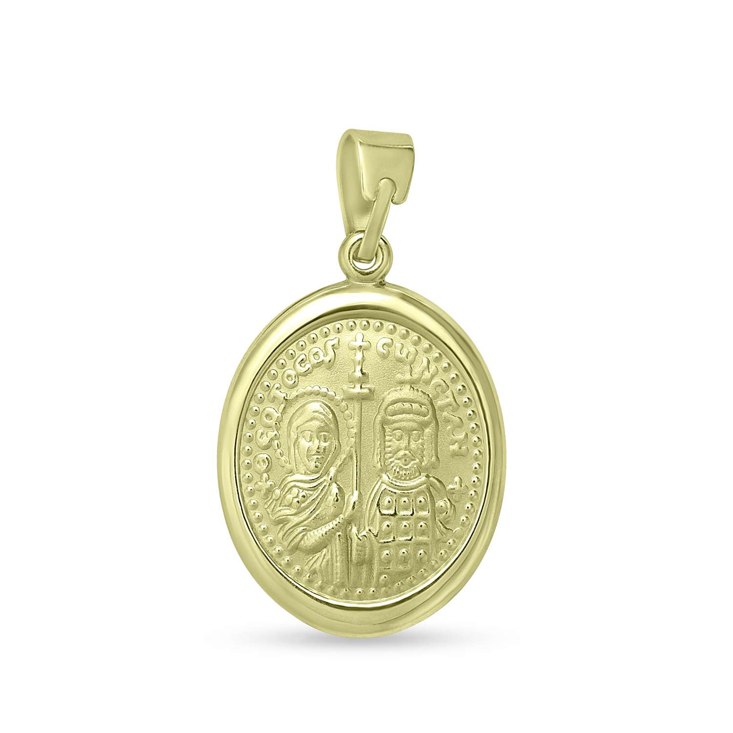 Κολιέ φυλαχτό για κορίτσι και αγόρι με την μορφή της Παναγίας και του Χριστού σε κίτρινο και λευκό χρυσό εννέα καρατίων με πίσω όψη παράσταση Κωνσταντινάτο.