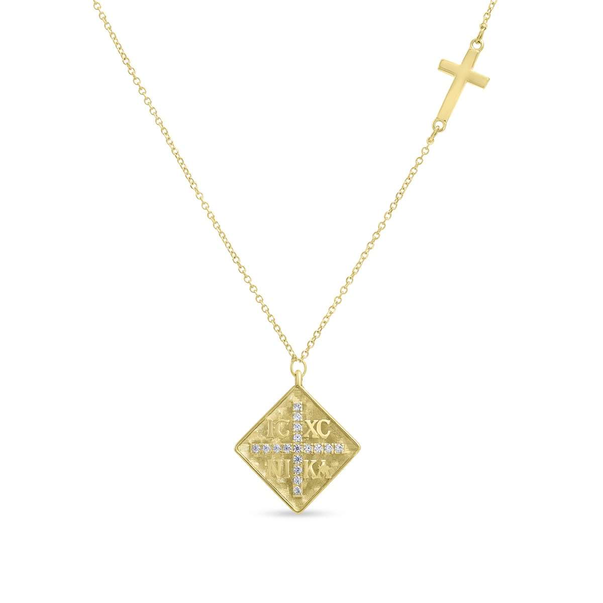 Κολιέ Κωνσταντινάτο από χρυσό δεκατεσσάρων καρατίων με παράσταση Ιησούς Χριστός Νικά και ζιρκόν