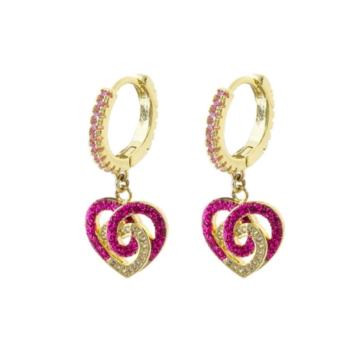 Loisir Σκουλαρίκια Dolley μεταλλικά επίχρυσα κρικάκια με καρδιά, φούξια glitter και ζιργκόν 03L15-01858