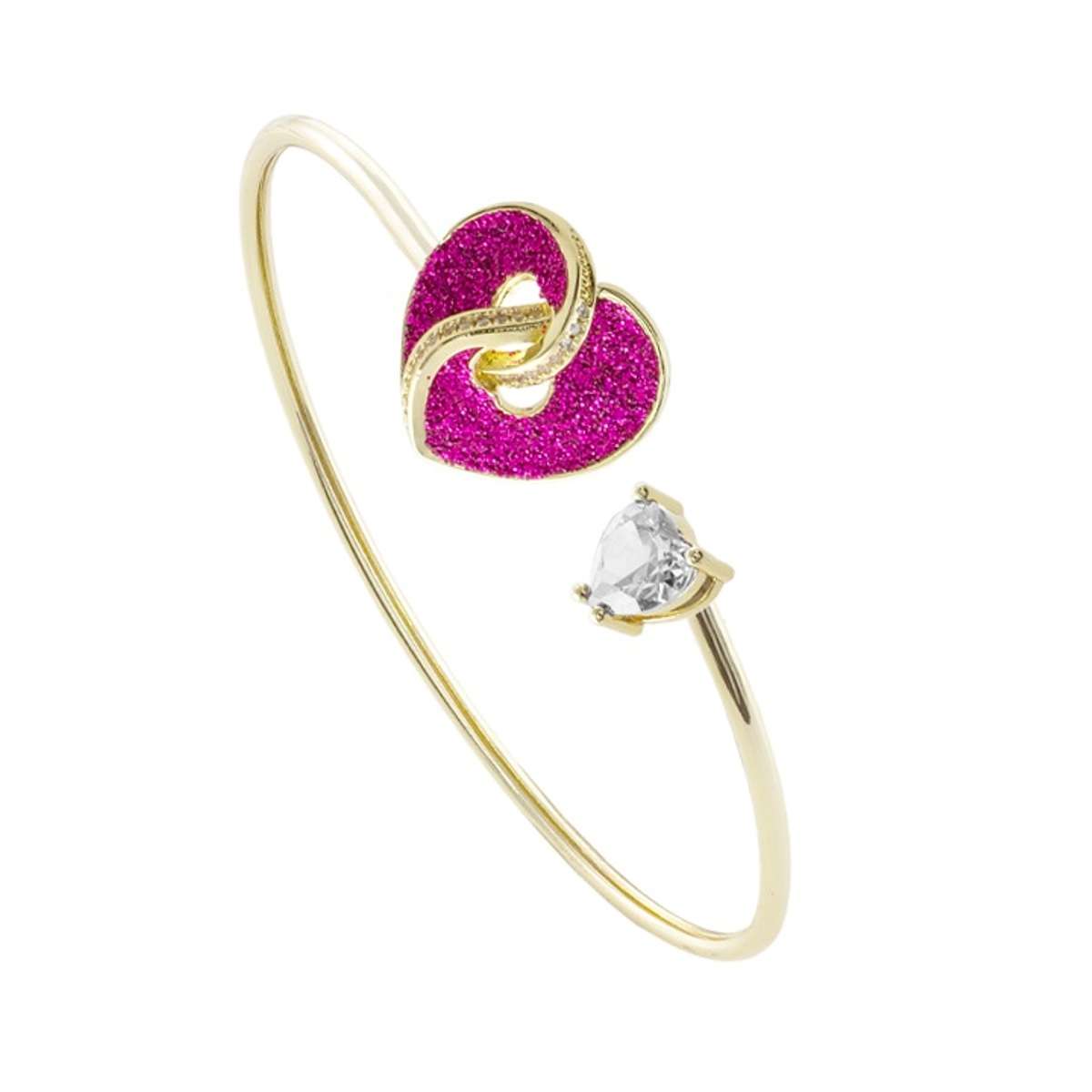 Loisir Βραχιόλι Dolley μεταλλικό επίχρυσο σταθερό με καρδιά, φούξια glitter και ζιργκόν 02L15-01917