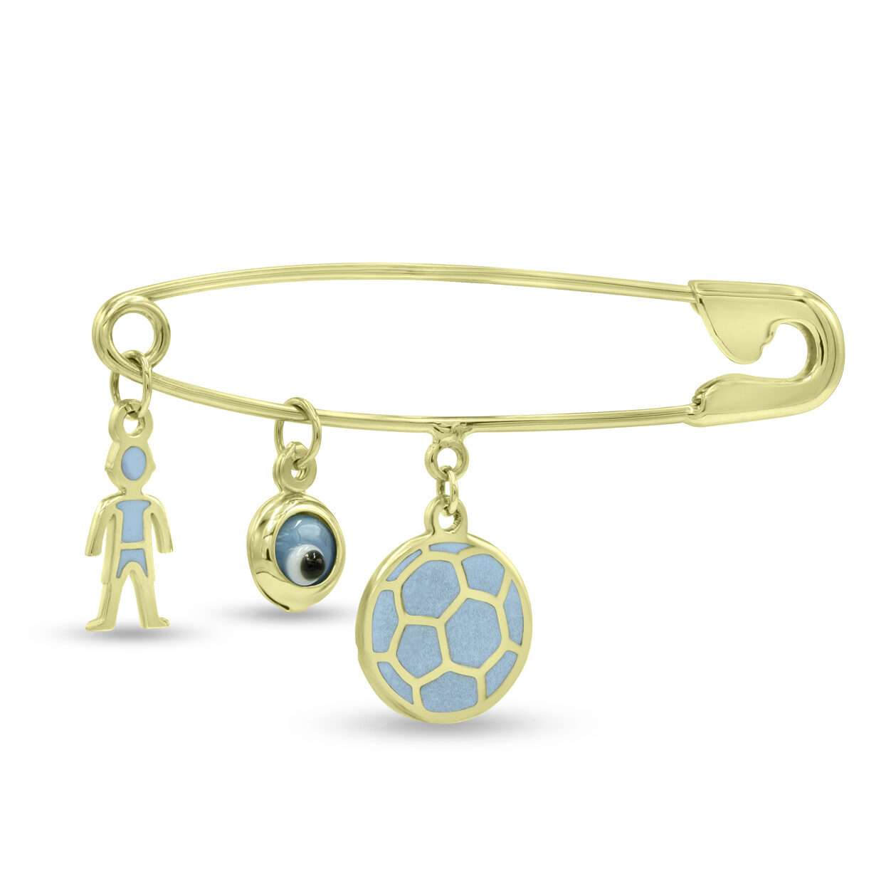 Μια πανέμορφη παιδική παραμάνα για αγοράκι, με αγόρι, ματάκι και μπάλα ποδοσφαίρου, σε κίτρινο χρυσό εννέα καρατίων με σμάλτο