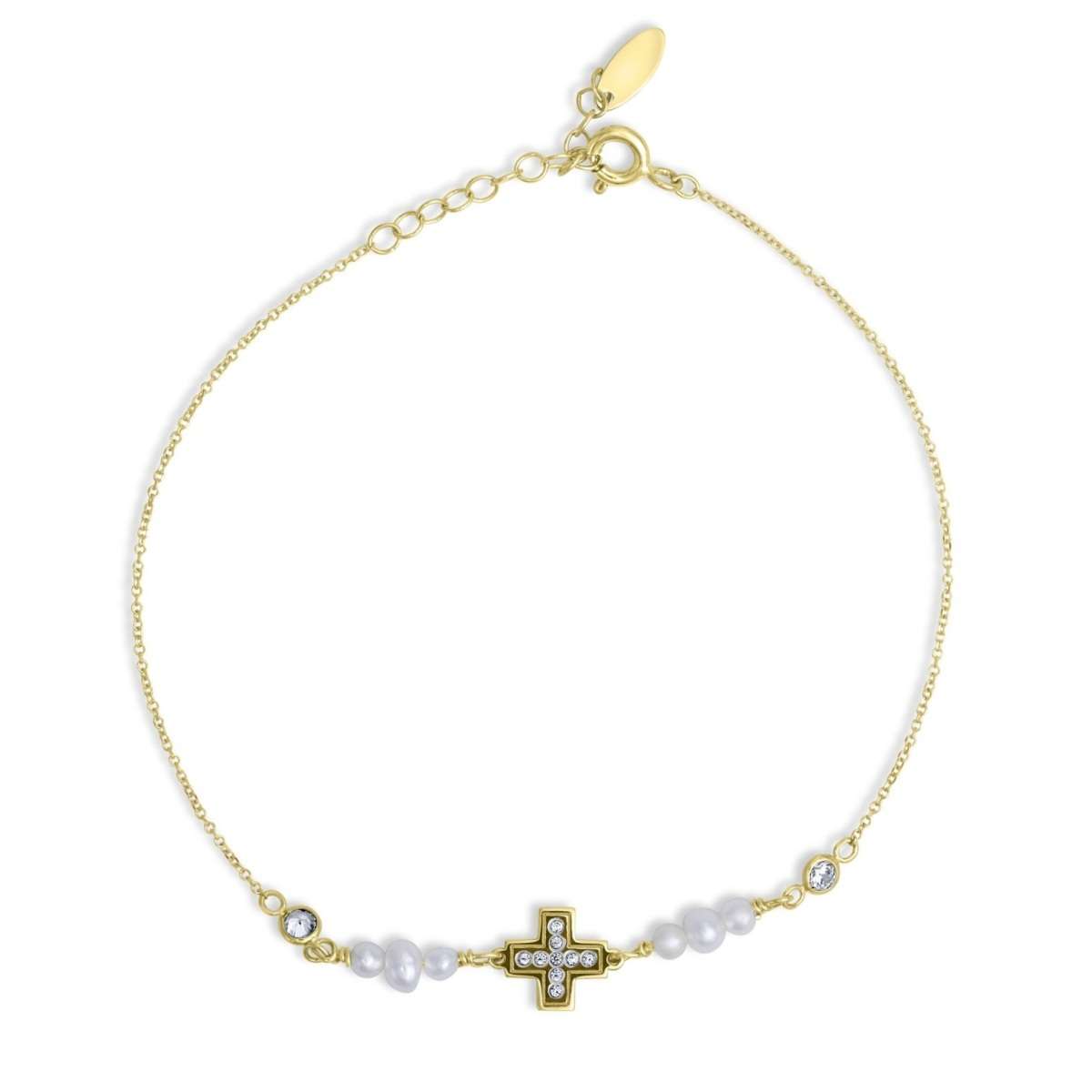 Ένα εντυπωσιακό, νεανικό και λαμπερό βραχιόλι με σταυρουδάκι, σε κίτρινο χρυσό εννέα καρατίων με μαργαριτάρι και ζικρόν